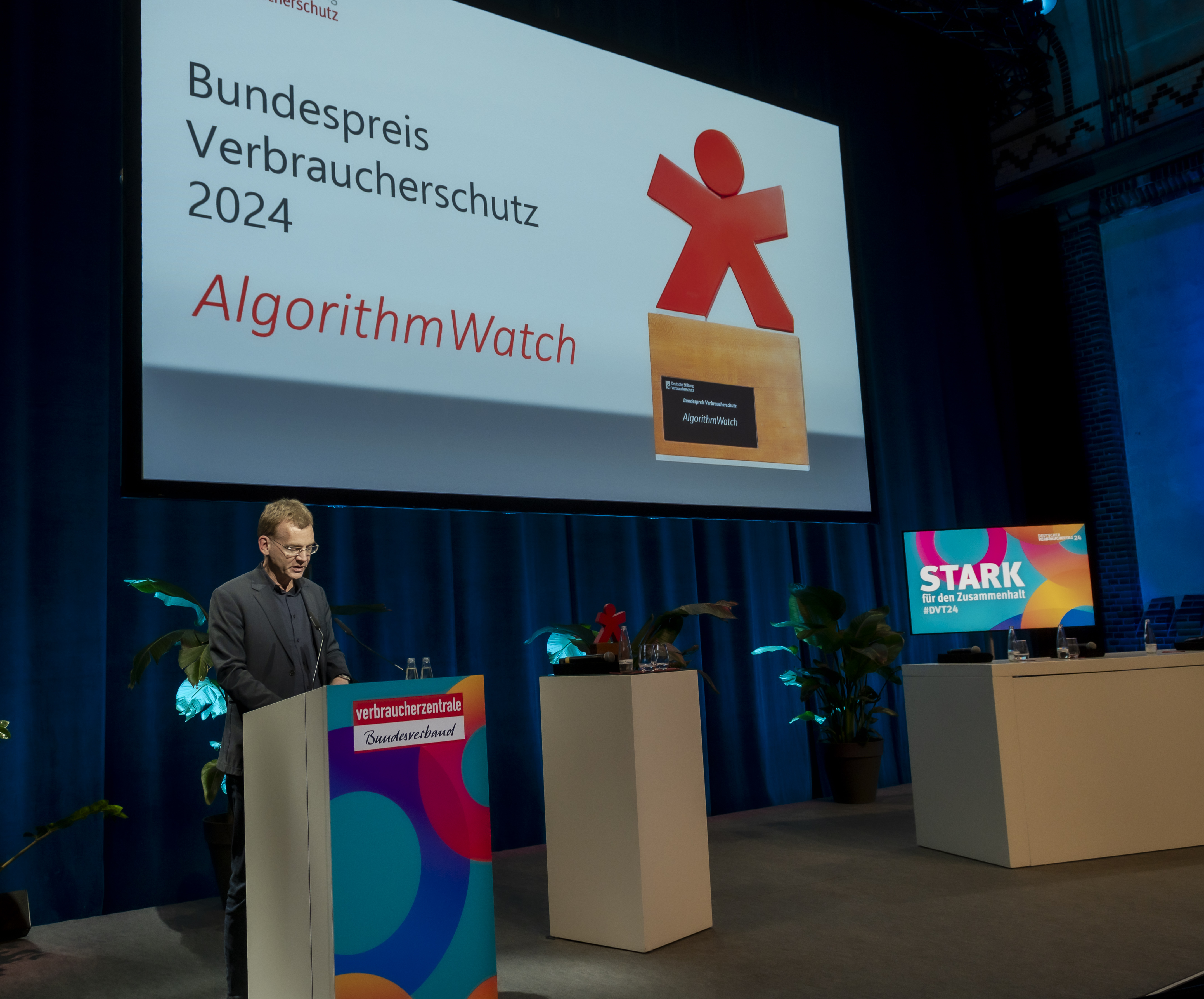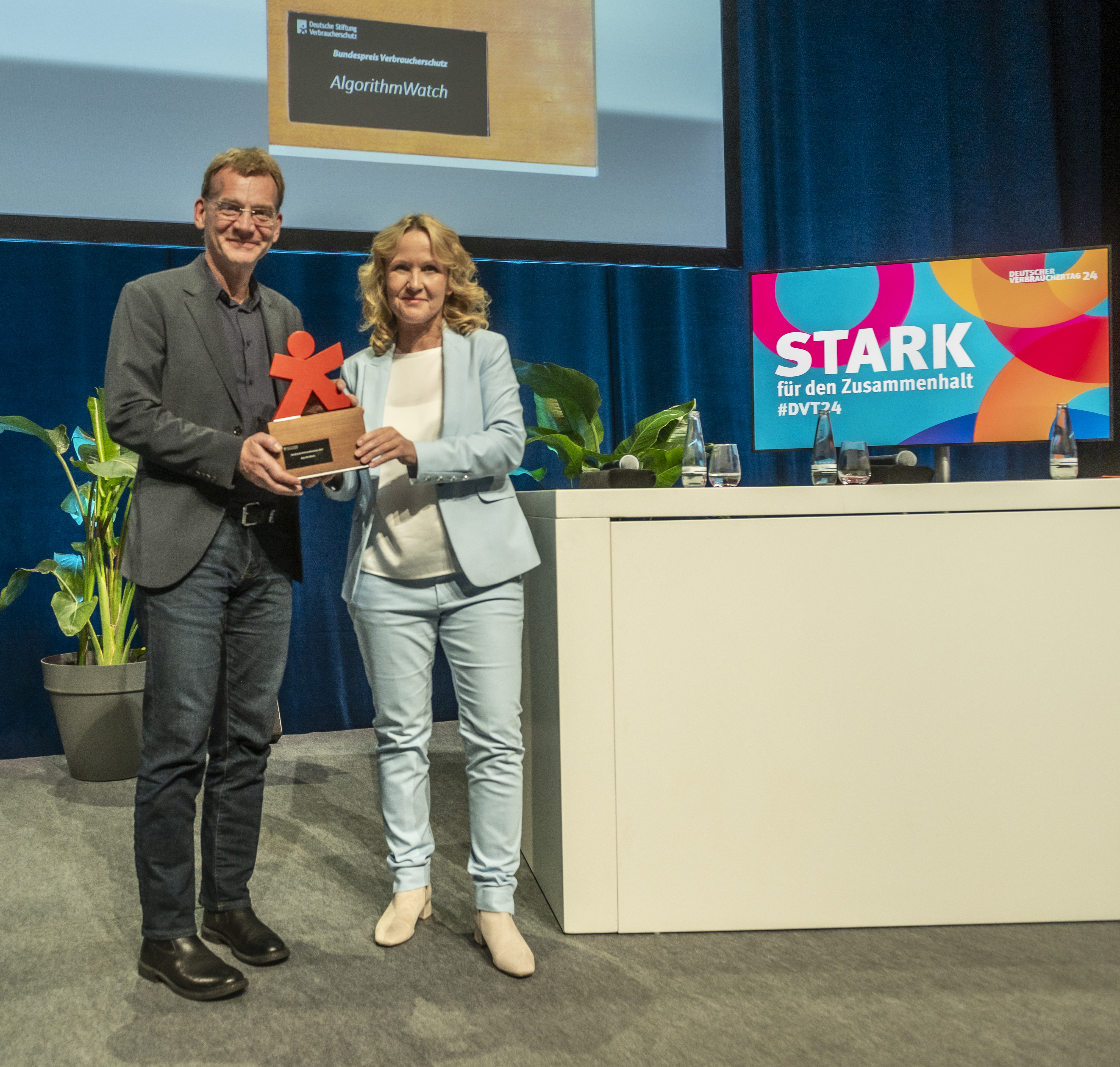 Die Deutsche Stiftung Verbraucherschutz (DSV) hat zum siebenten Mal den Bundespreis Verbraucherschutz für herausragenden Einsatz im Verbrauchschutz vergeben. Eine vierzehnköpfige Jury wählt AlgorithmWatch aus zahlreichen eingereichten Preisvorschlägen als diesjährigen Sieger aus. Auf dem Deutschen Verbrauchertag des Verbraucherzentrale Bundesverbands (vzbv) überreicht Bundesministerin Steffi Lemke den Preis an Matthias Spielkamp, Geschäftsführer von AlgorithmWatch.