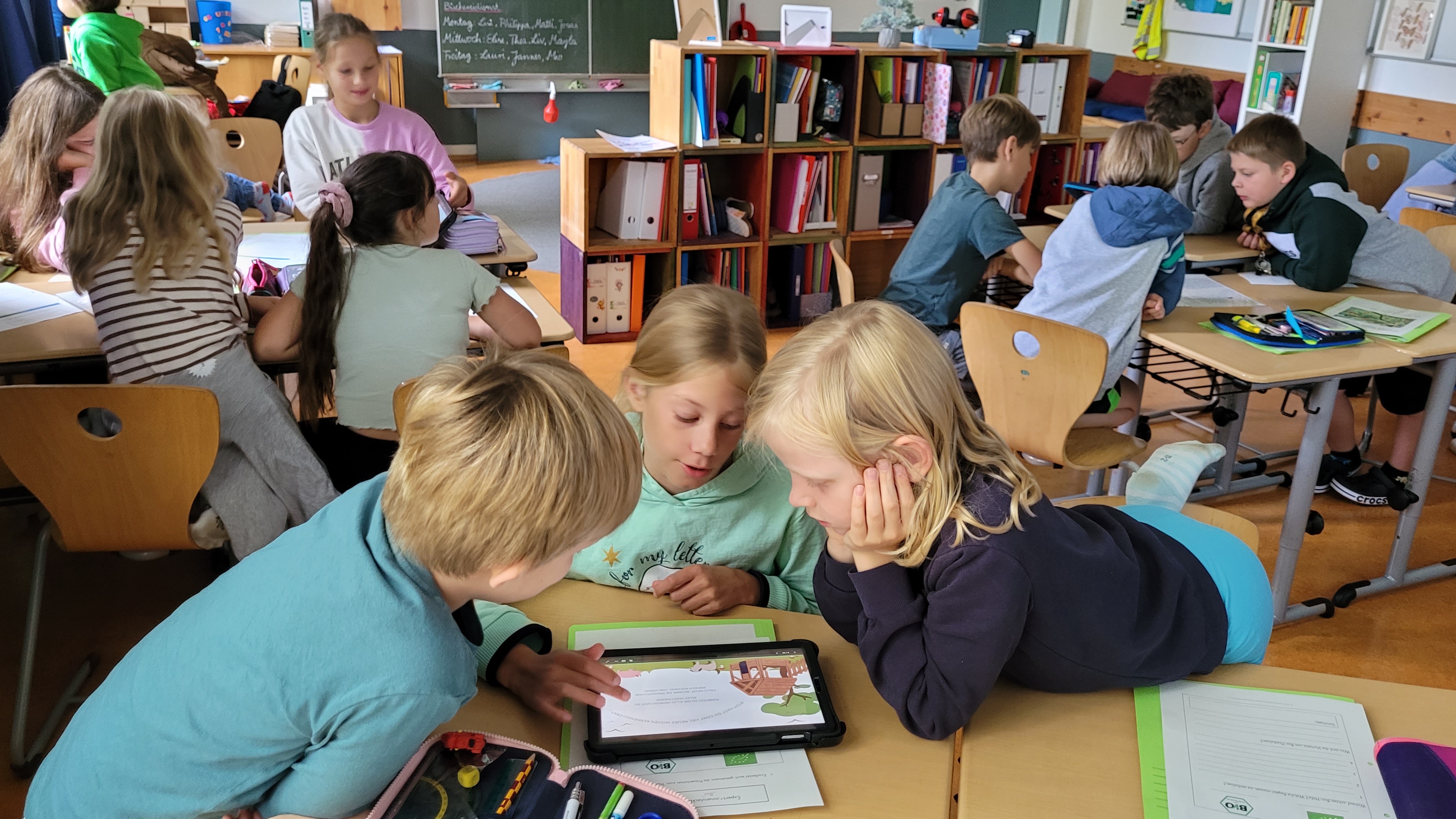 Das Projektteam und die Grundschulkinder sind fleißig. In Workshops erkunden sie spielerisch Themen der Nachhaltigkeit und tauchen in die Spieleentwicklung ein.